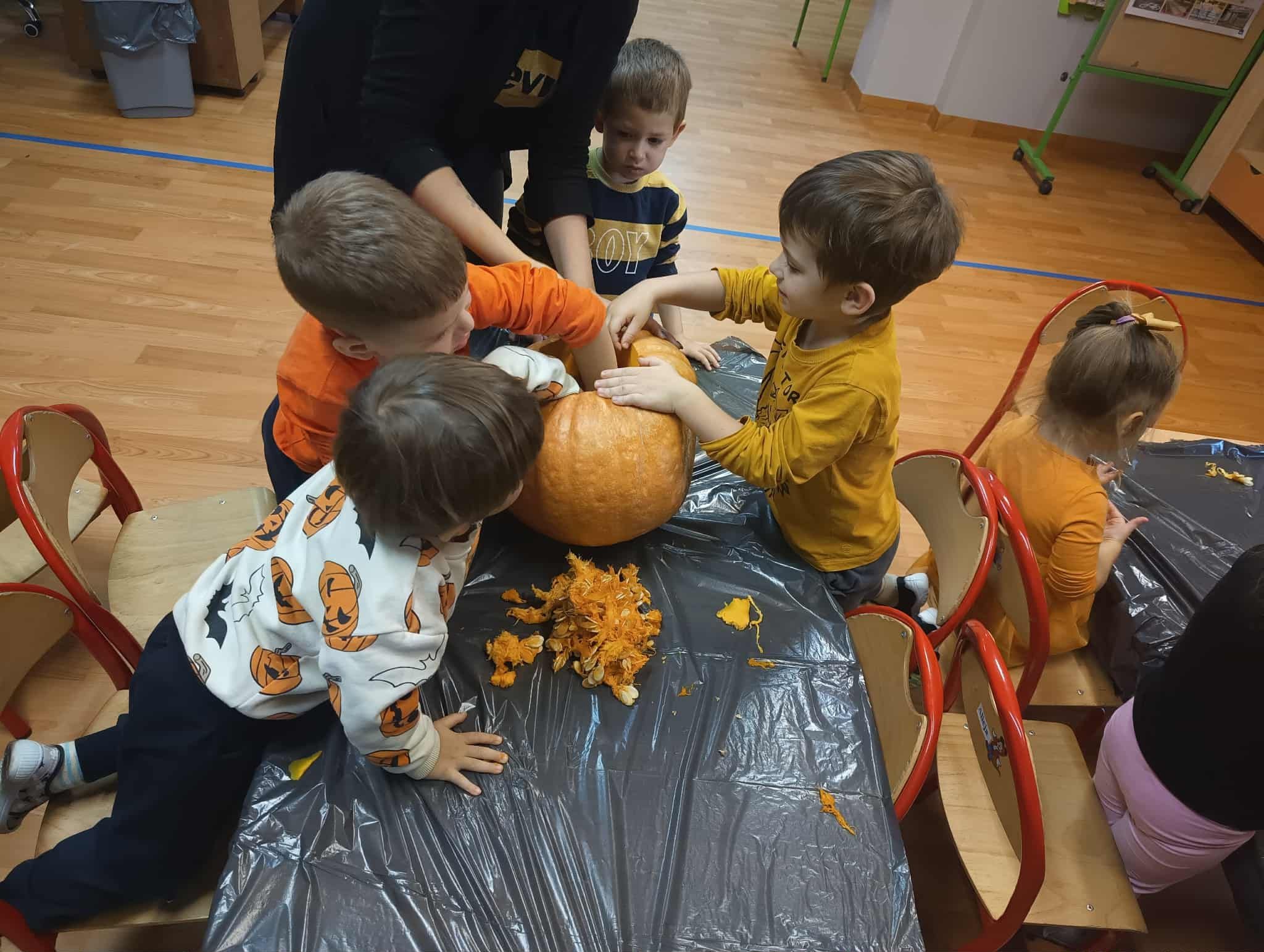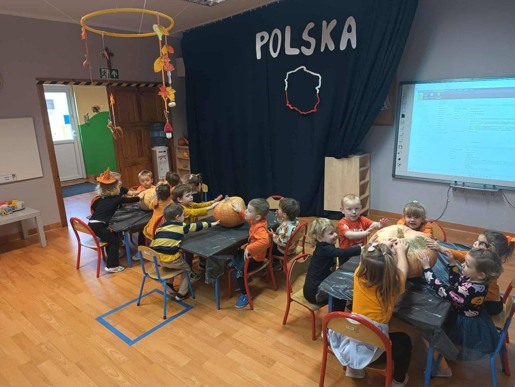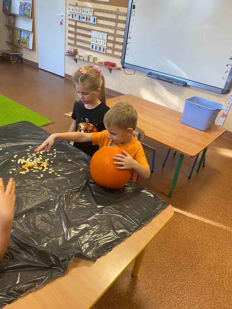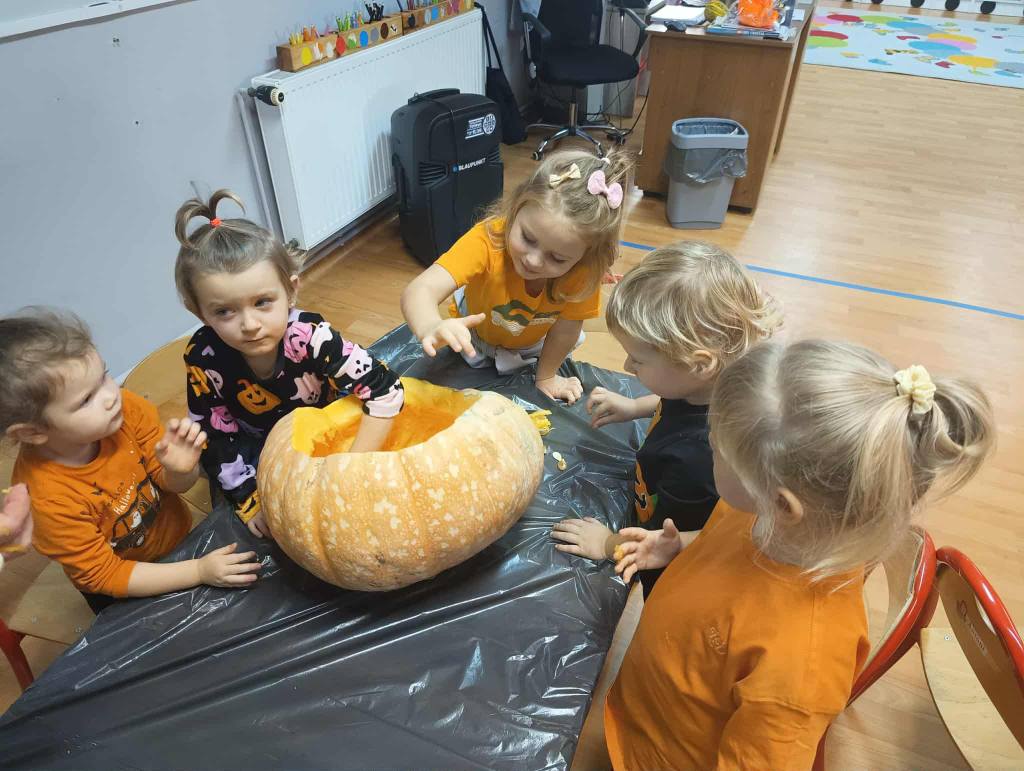 Dnia 31 października w przedszkolu było bardzo pomarańczowo i dyniowo. Z okazji wyjątkowego święta dzieci przyniosły dynie i ubrały się na kolor pomarańczowy. Dynia królowała ! Było wiele zabaw tematycznych, sportowych, dydaktycznych, sensorycznych, jesienne dekoracje.Wszystkie przedszkolaki spędziły ten dzień aktywnie z licznymi dyniowymi atrakcjami.
