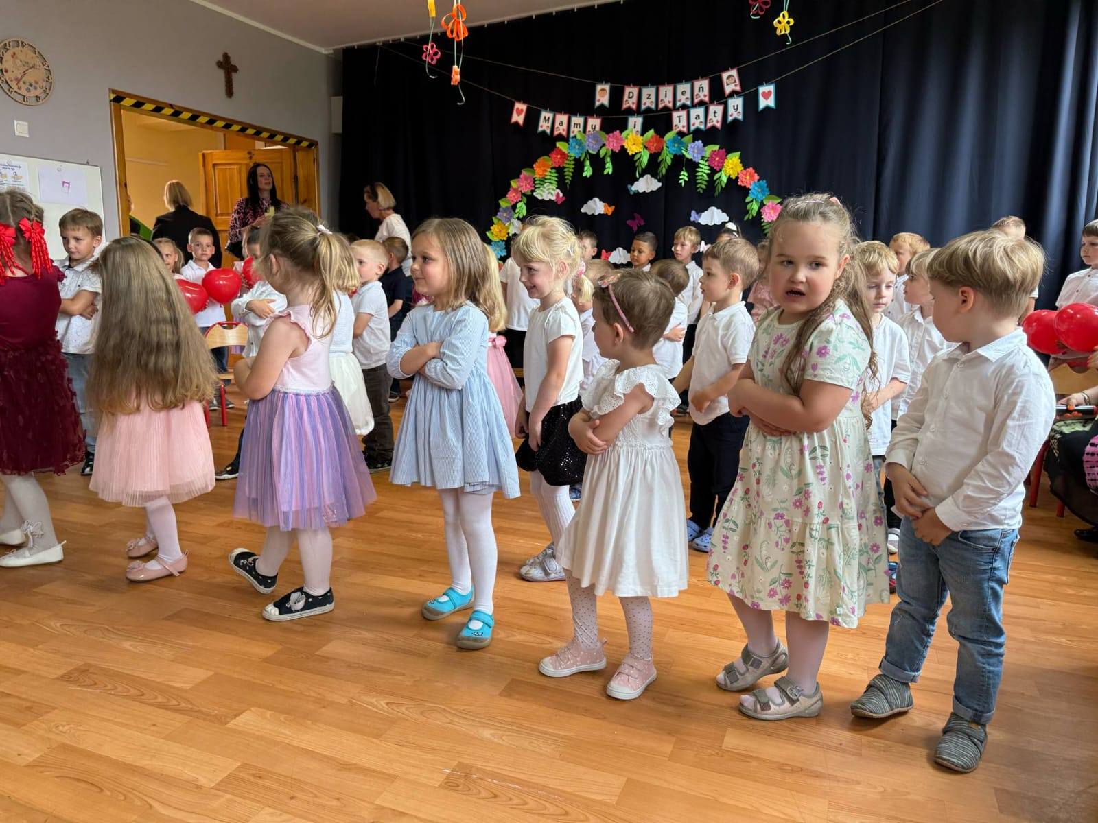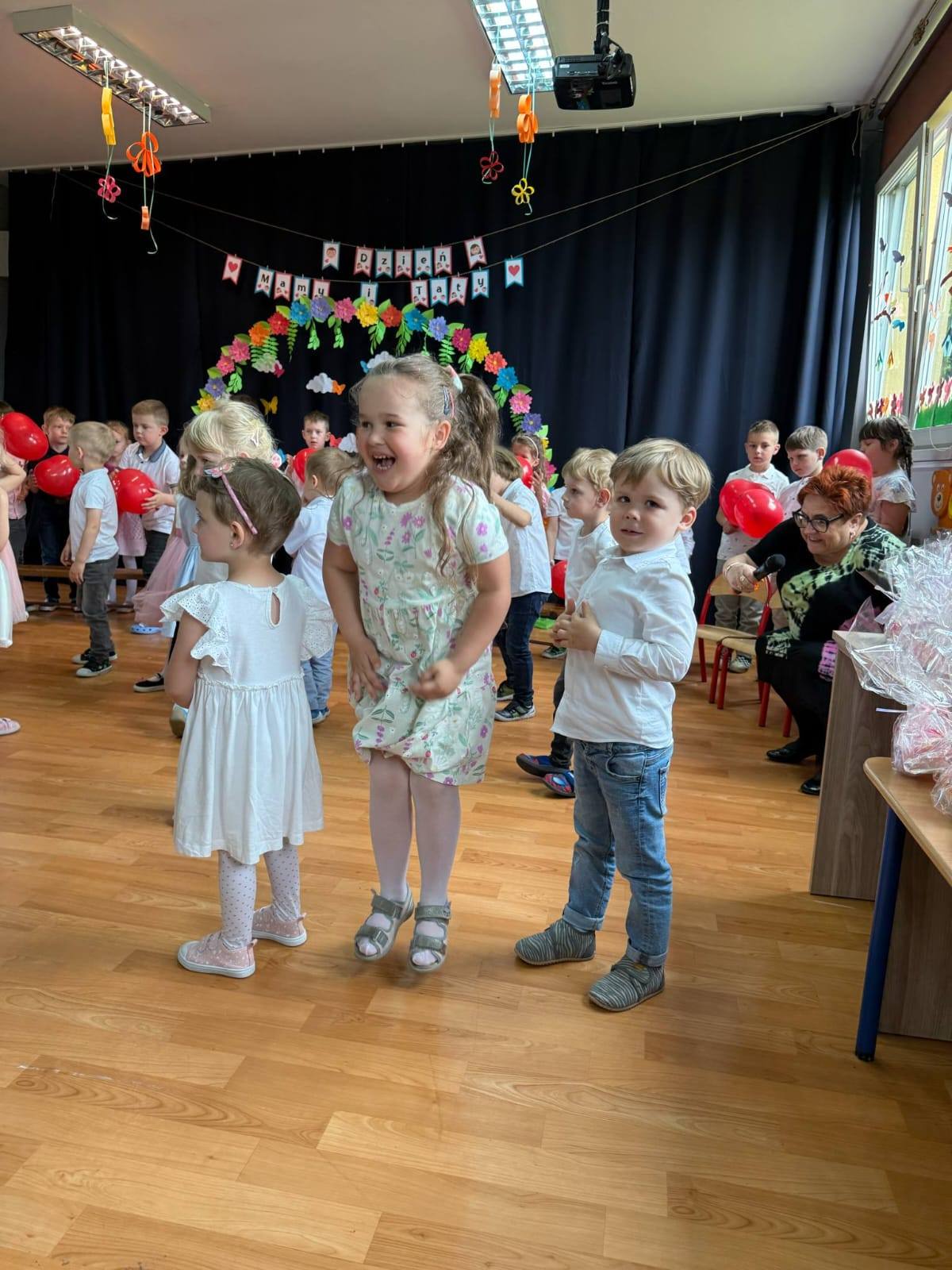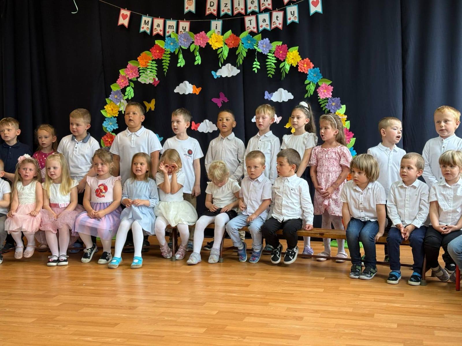 Dlatego też co roku w naszym przedszkolu pomagamy dzieciom wyrazić ich miłość do rodziców organizując uroczystość Dnia Mamy i Taty. Grupa Zajączki i Wiewiórki wspolnie w pięknych strojach prezentowały program artystyczny. Były wiersze, piosenki, tańce oraz życzenia dla kochanych rodziców.