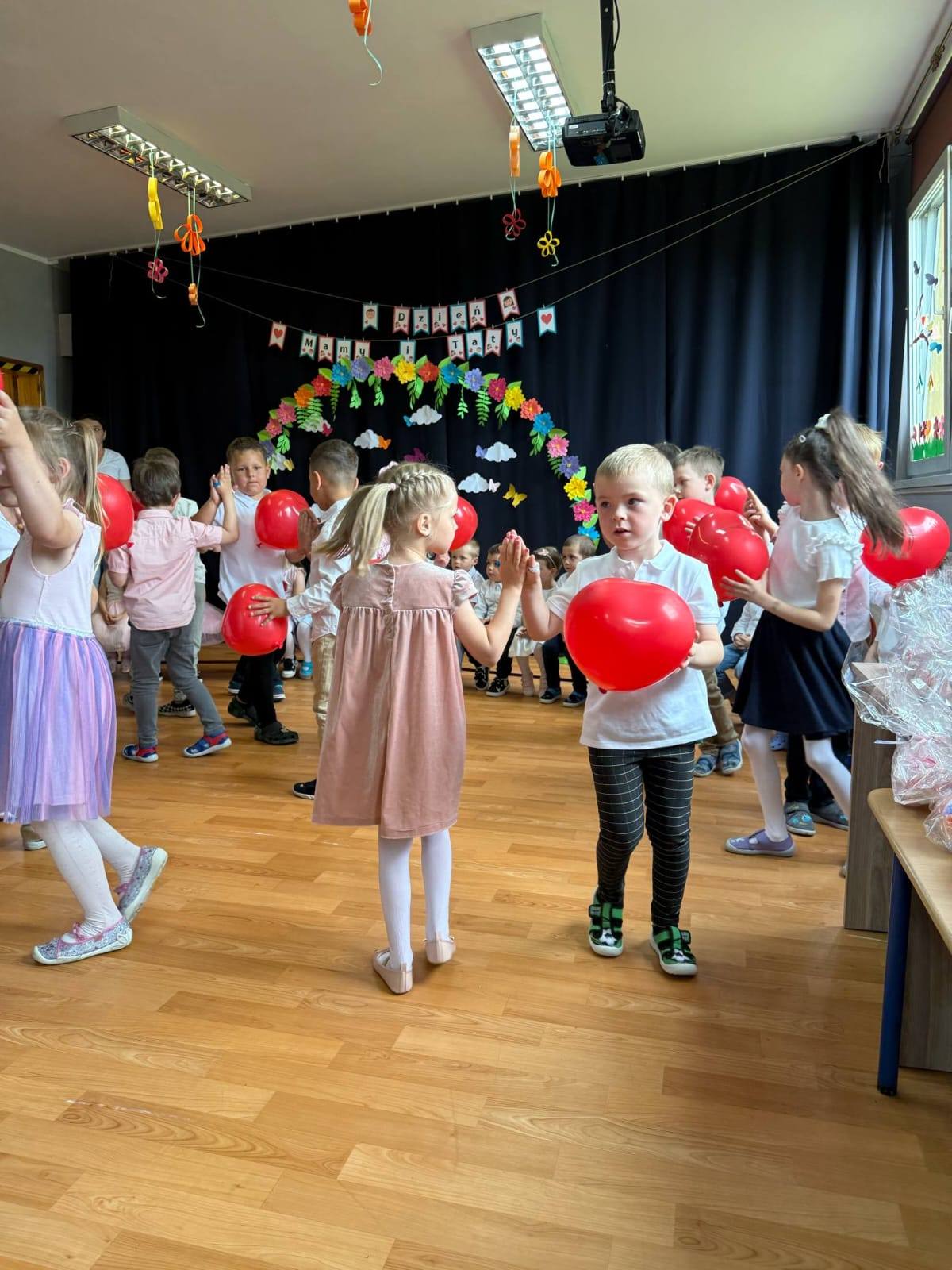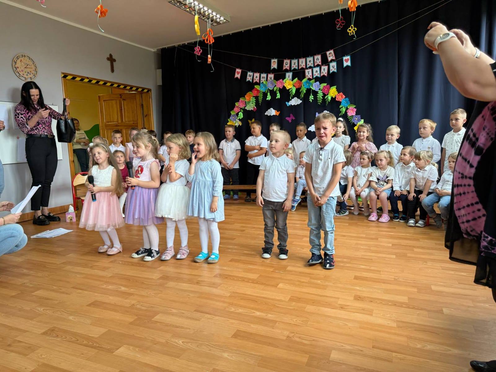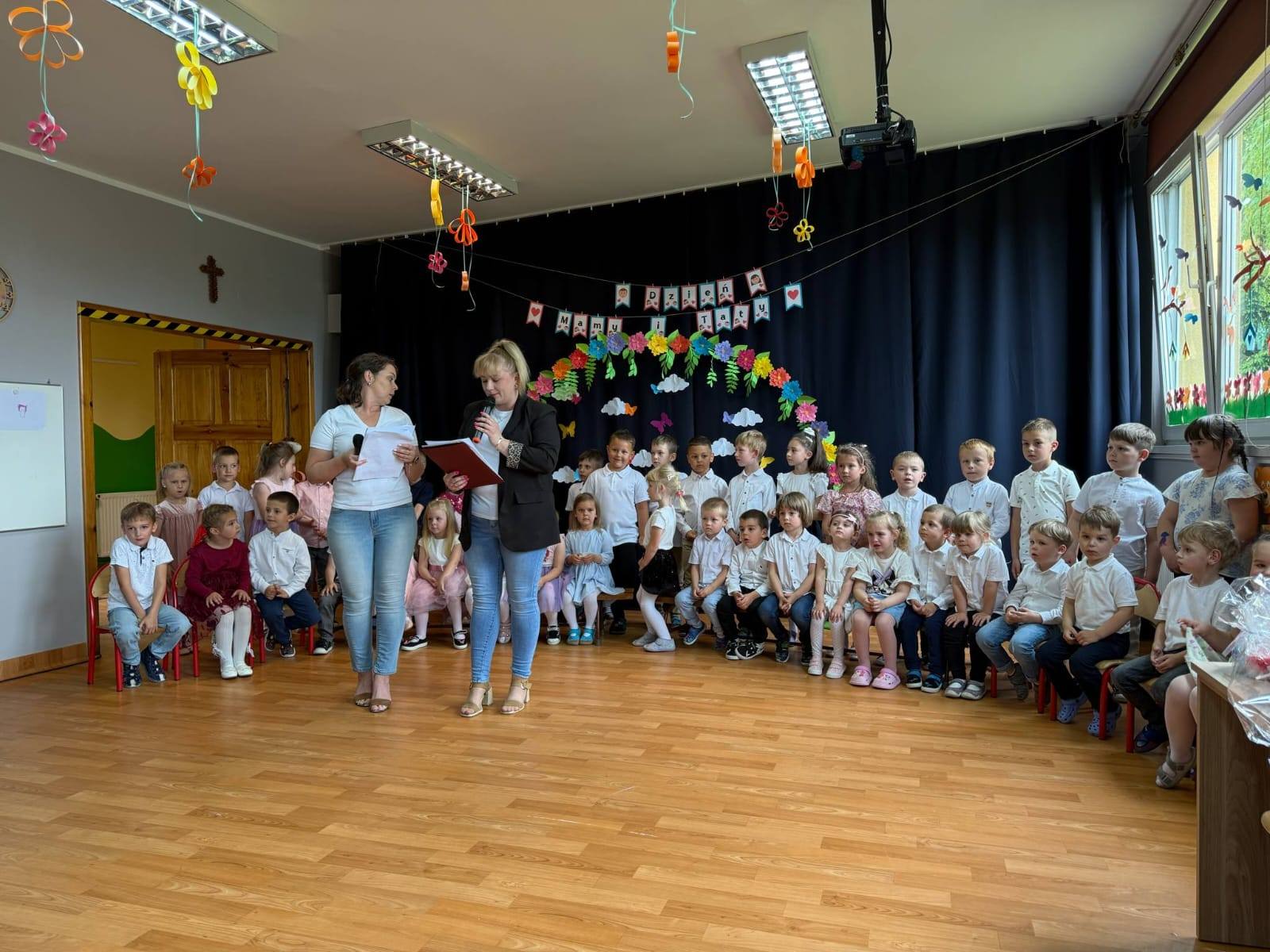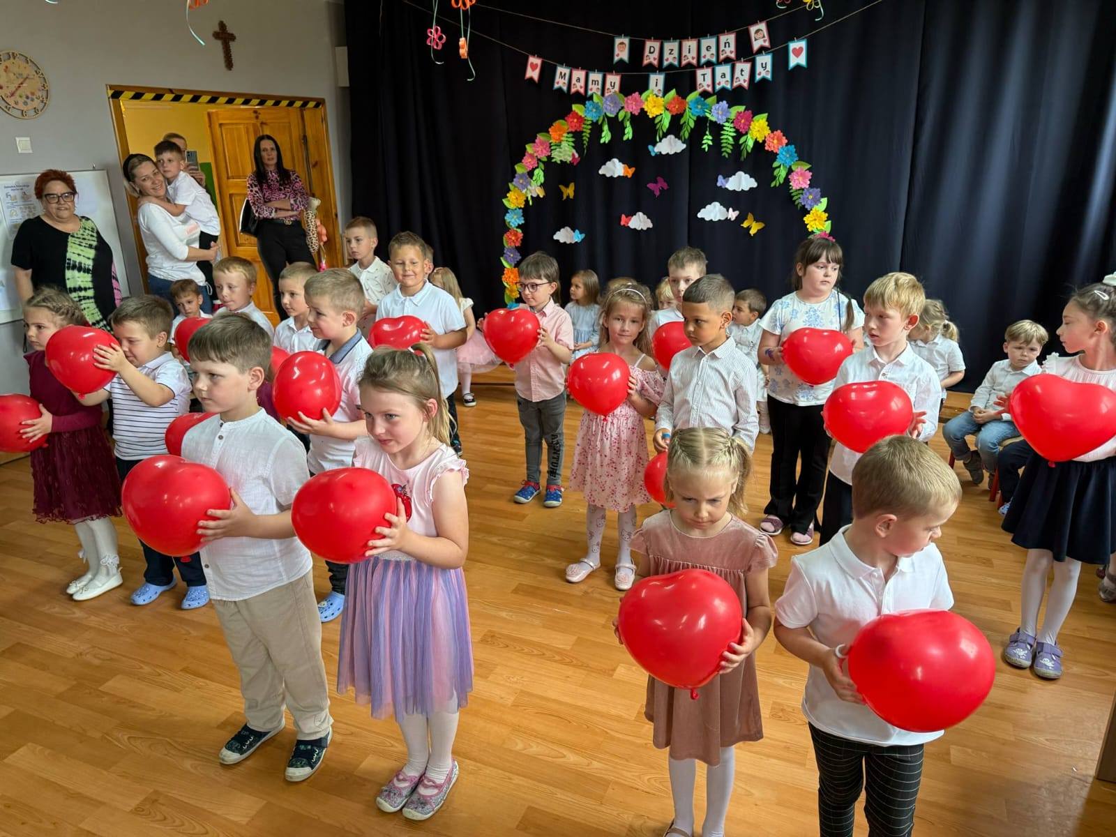 Dlatego też co roku w naszym przedszkolu pomagamy dzieciom wyrazić ich miłość do rodziców organizując uroczystość Dnia Mamy i Taty. Grupa Zajączki i Wiewiórki wspolnie w pięknych strojach prezentowały program artystyczny. Były wiersze, piosenki, tańce oraz życzenia dla kochanych rodziców.