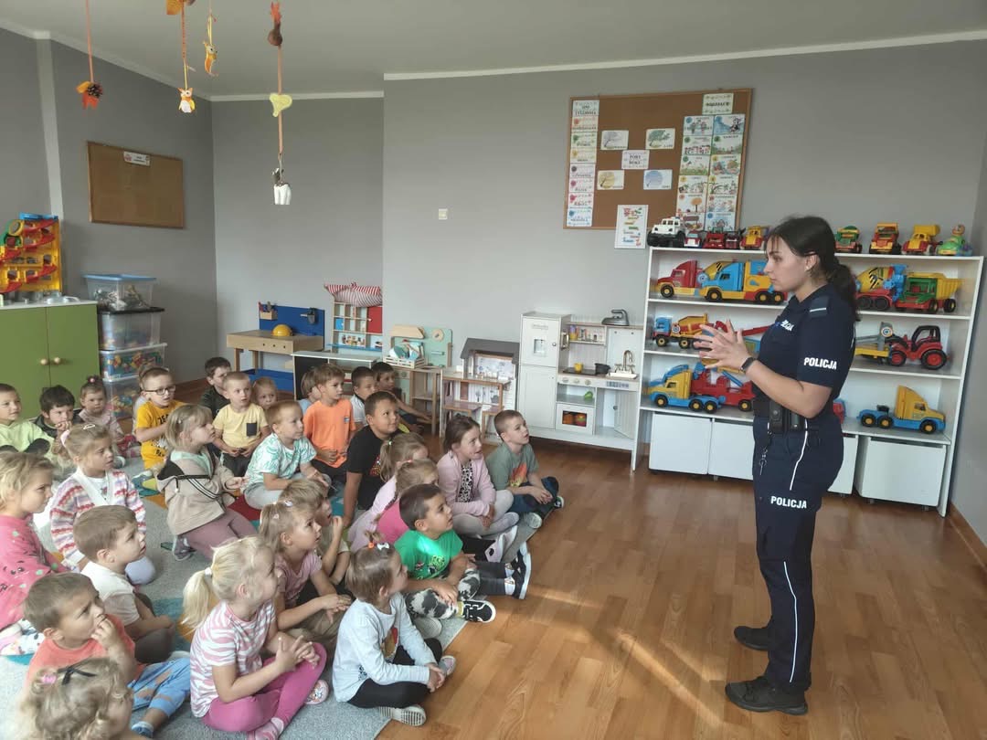 We wtorek do naszego przedszkola przyjechała Pani Policjant. Opowiedziała o swojej pracy, bezpieczeństwie na drodze i zasadach korzystania z różnych sprzętów np.: rowerek, hulajnoga.