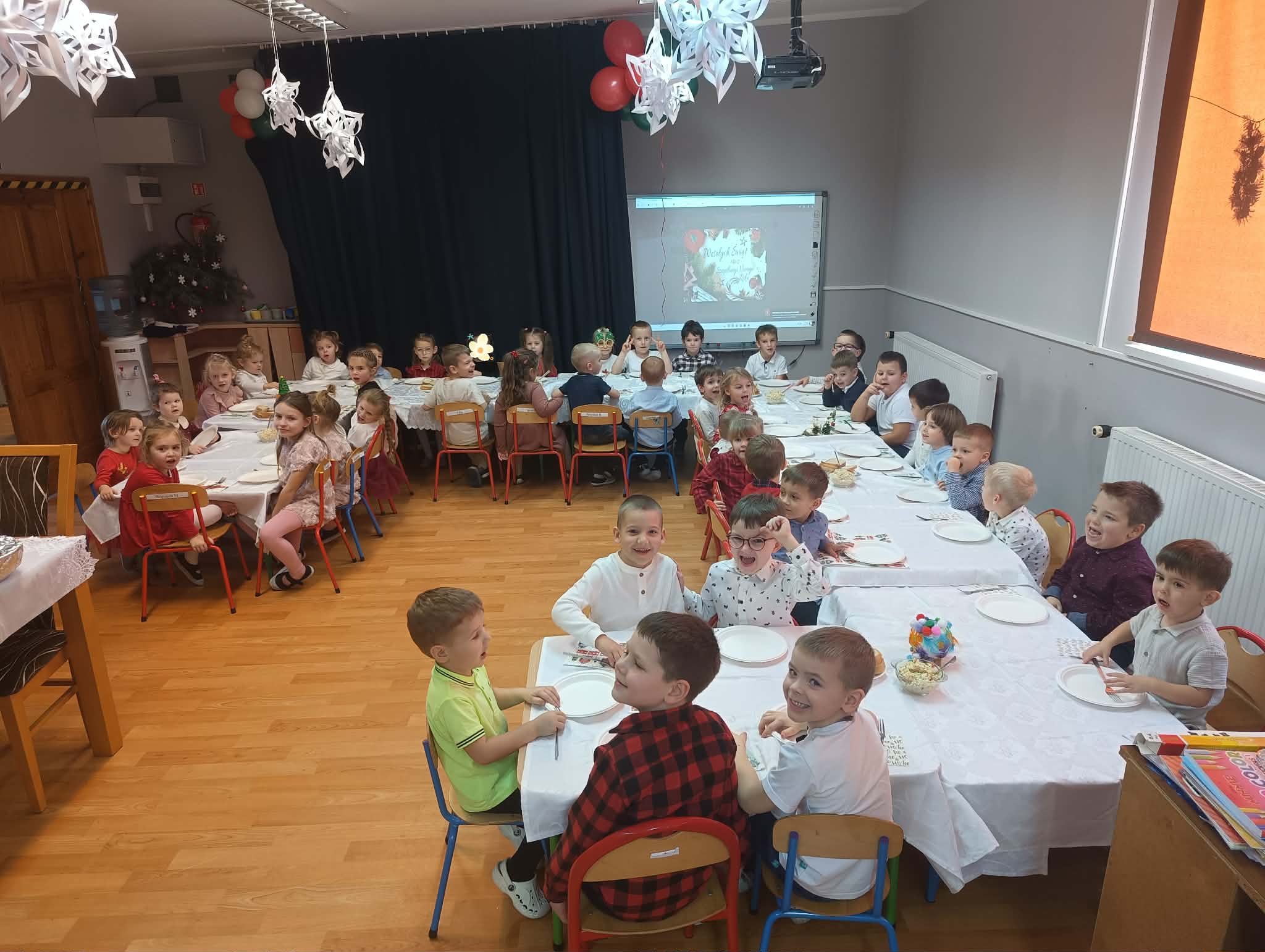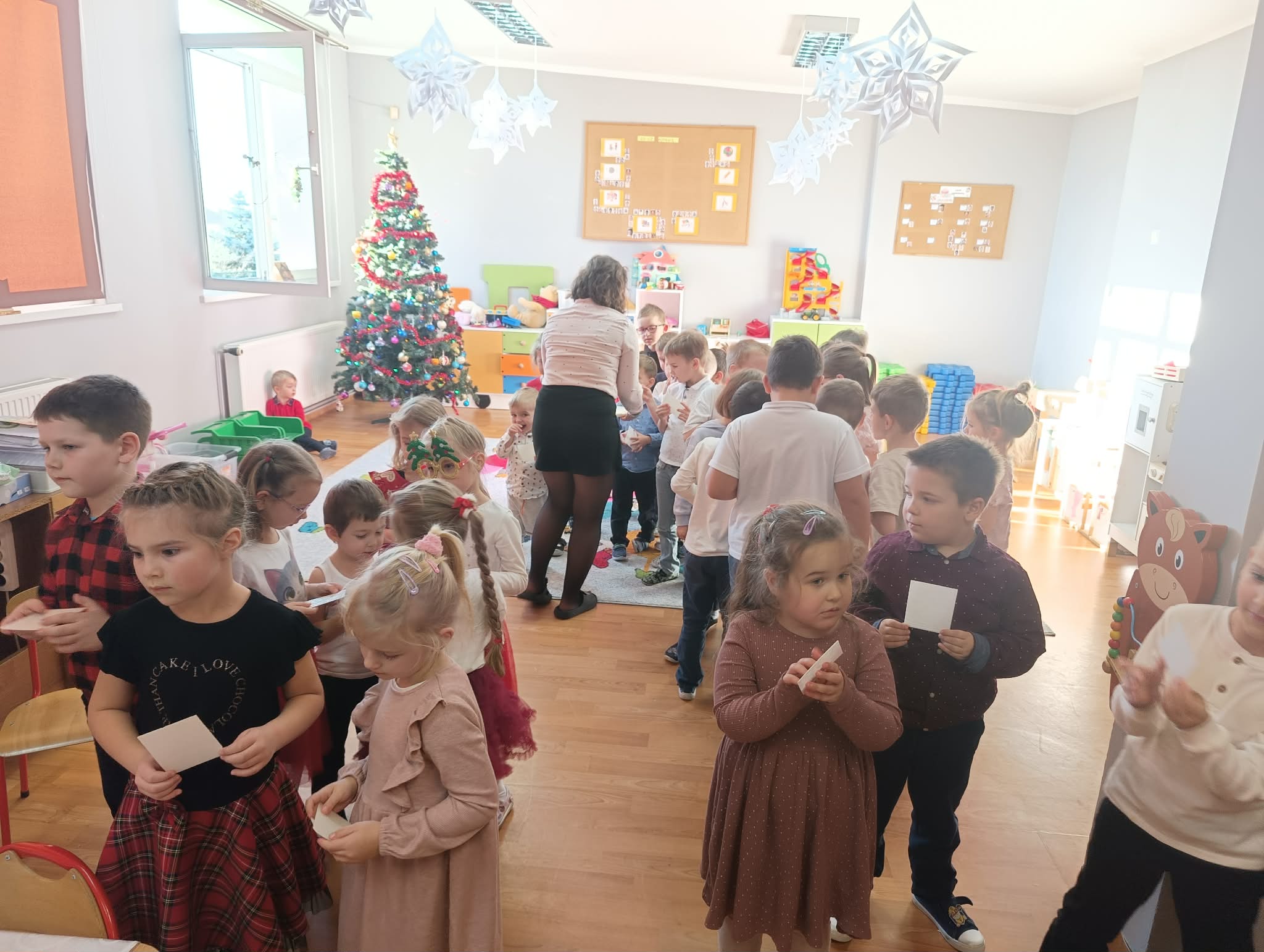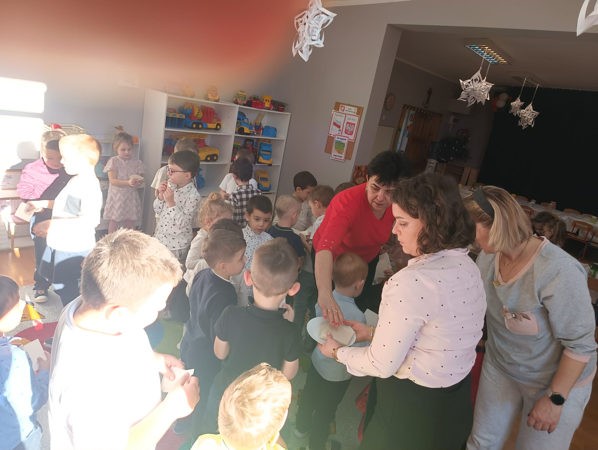 W naszym przedszkolu odbyła się uroczysta wigilia grup Wiewiórki i Zajączki. W świątecznie udekorowanej sali dzieci wspólnie śpiewały kolędy, poznawały bożonarodzeniowe tradycje oraz dzieliły się opłatkiem. Spotkanie upłynęło w ciepłej, radosnej atmosferze i pozwoliło dzieciom poczuć magię nadchodzących Świąt Bożego Narodzenia.