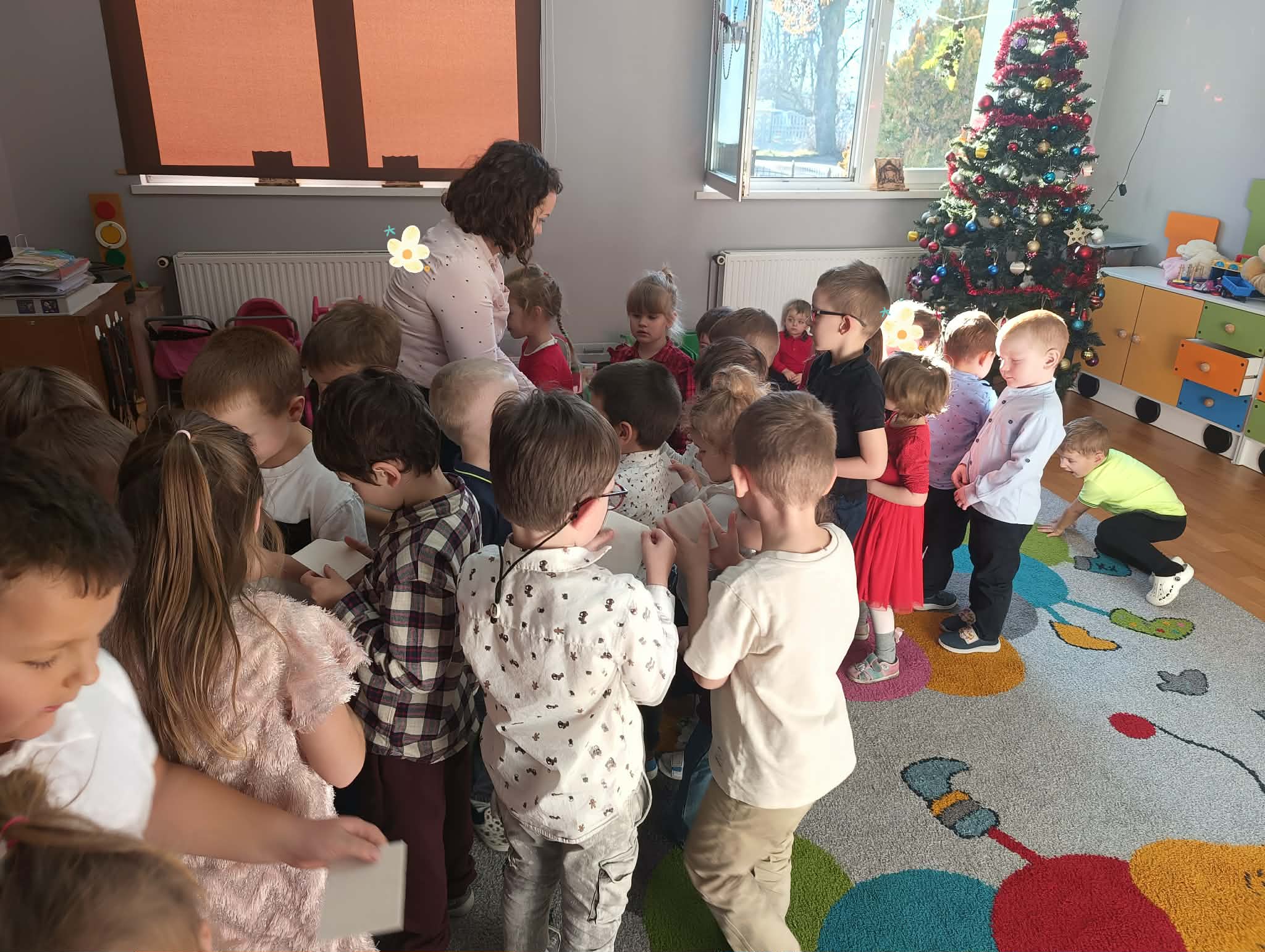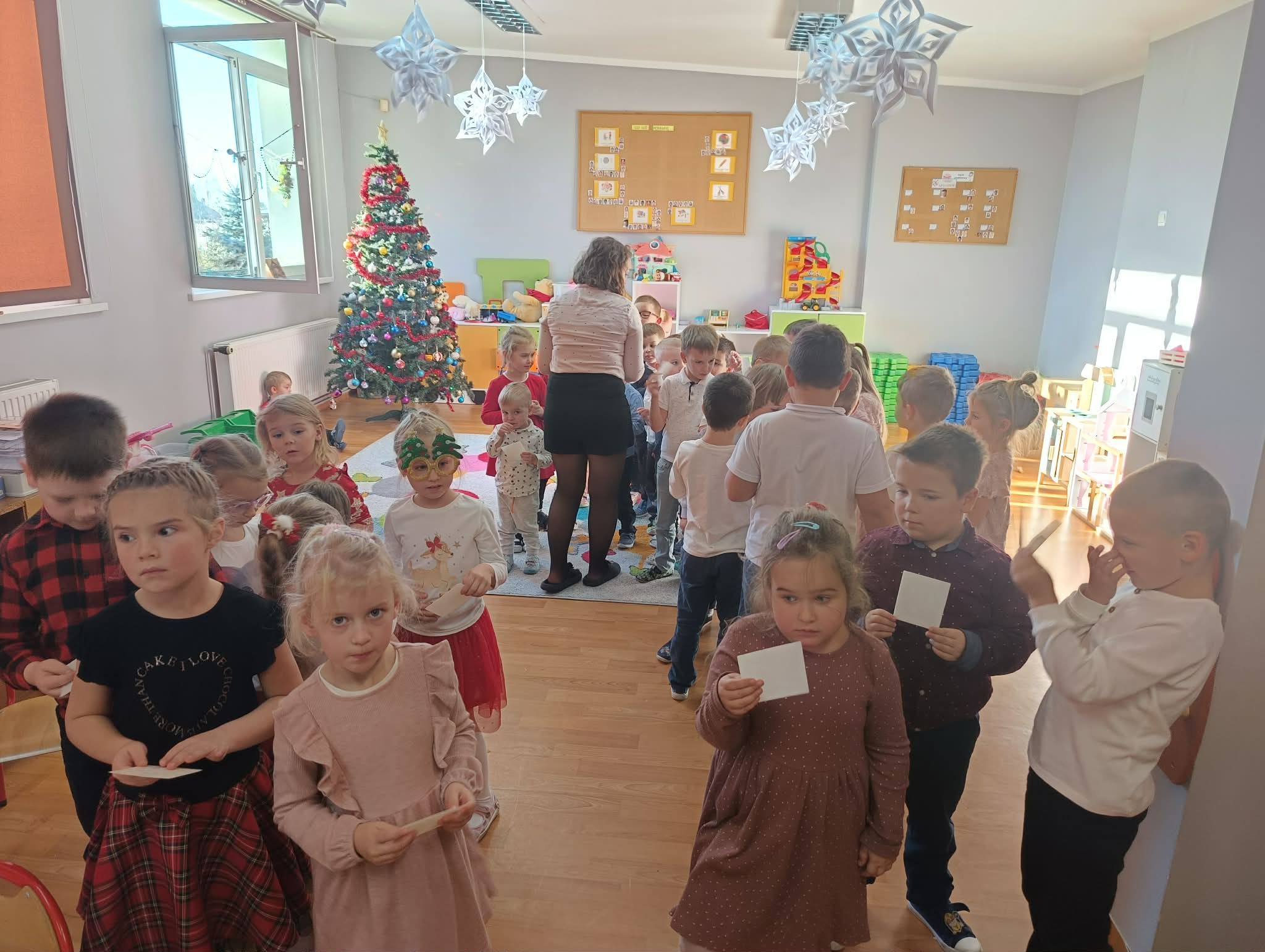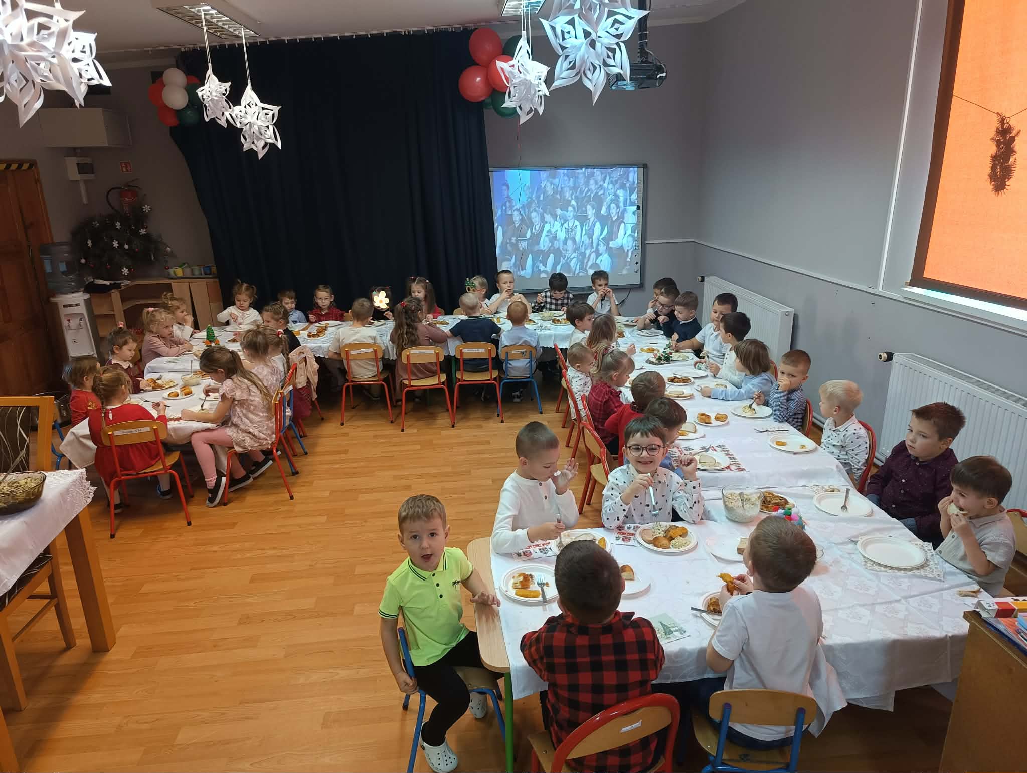 W naszym przedszkolu odbyła się uroczysta wigilia grup Wiewiórki i Zajączki. W świątecznie udekorowanej sali dzieci wspólnie śpiewały kolędy, poznawały bożonarodzeniowe tradycje oraz dzieliły się opłatkiem. Spotkanie upłynęło w ciepłej, radosnej atmosferze i pozwoliło dzieciom poczuć magię nadchodzących Świąt Bożego Narodzenia.